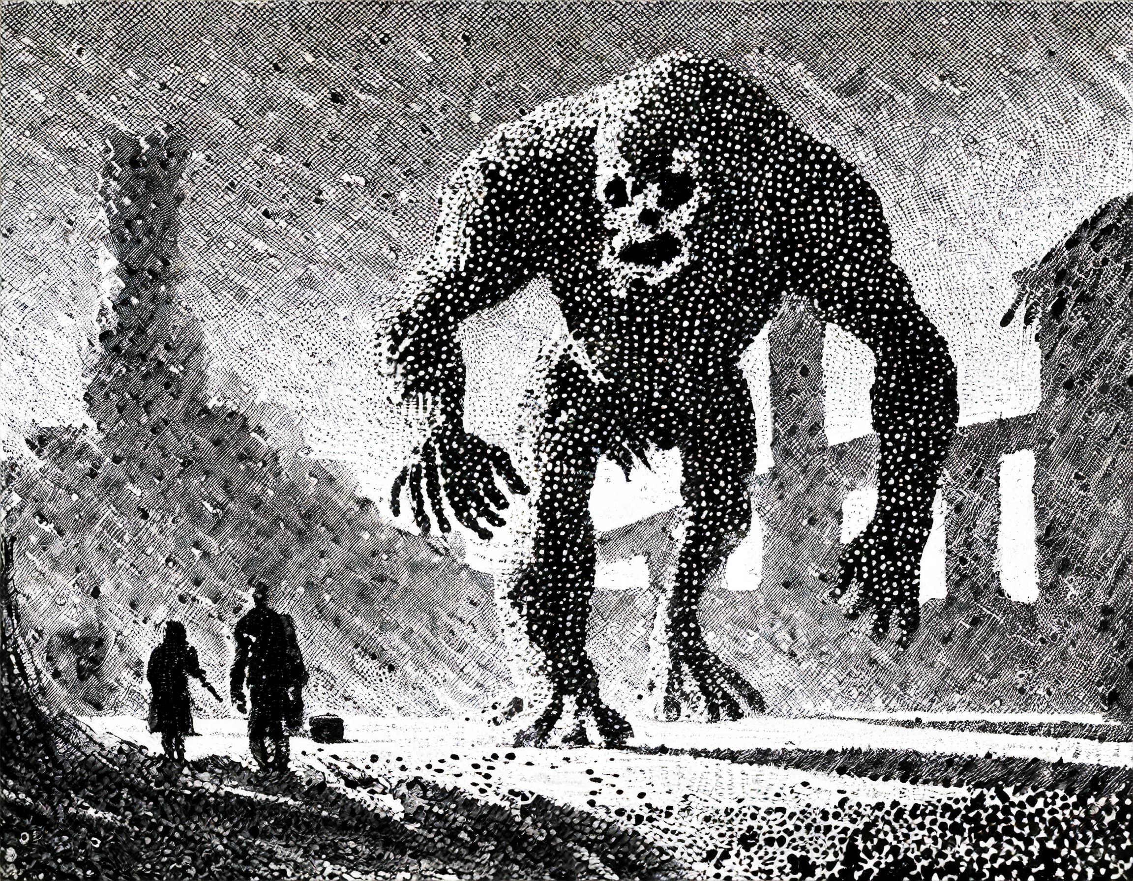 ある探検者のグループが廃墟の団地に挑むことを決意した。彼らは懐中電灯の明かりで暗闇を照らし、廃墟の中に足を踏み入れた。すると、不気味な気配と共に、巨大な怪物の影が現れた。その怪物はまるで人のような姿をしていたが、目は深い闇で覆われ、異次元の存在のような存在感を放っていた。